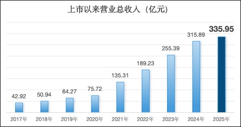 年报显示,2025年佛燃能源实现营业总收入335.95亿元,同比增长6.35%。自上市以来,公司业绩保持稳定增长,公司营业收入从2017年的42.92 亿元增长至 2025年的335.95亿元,年复合增速达29.33%。