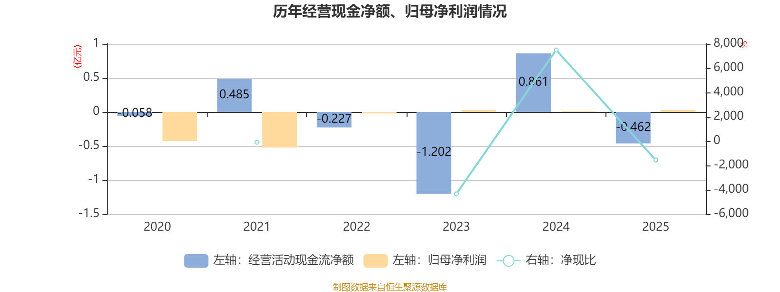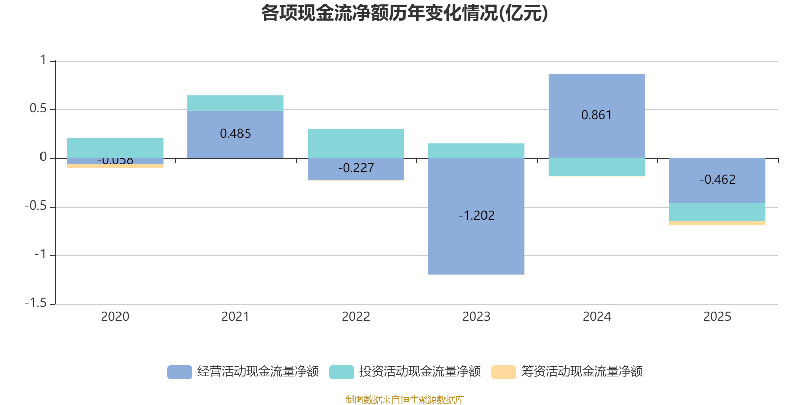 2025年,公司经营活动现金流净额为-4623.95万元,同比减少1.32亿元;筹资活动现金流净额-467.43万元,同比减少416.18万元;投资活动现金流净额-1839.35万元,上年同期为-1835.61万元。