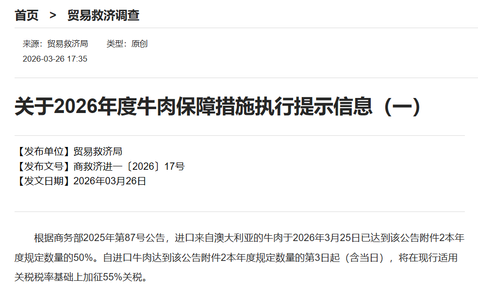 商务部公告,进口来自澳大利亚的牛肉于2026年3月25日已达到该公告附件2本年度规定数量的50%。自进口牛肉达到该公告附件2本年度规定数量的第3日起(含当日),将在现行适用关税税率基础上加征55%关税。