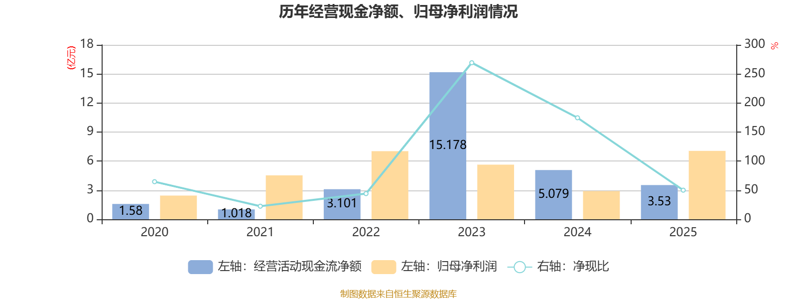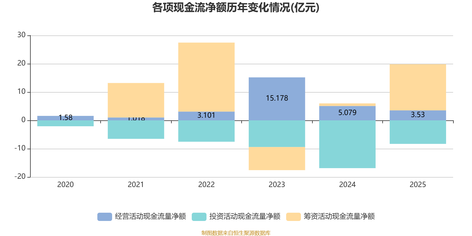 2025年,公司经营活动现金流净额为3.53亿元,同比下降30.5%;筹资活动现金流净额16.29亿元,同比增加15.37亿元;投资活动现金流净额-8.3亿元,上年同期为-16.87亿元。