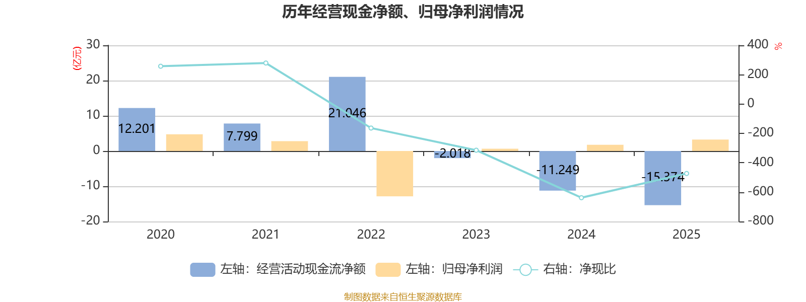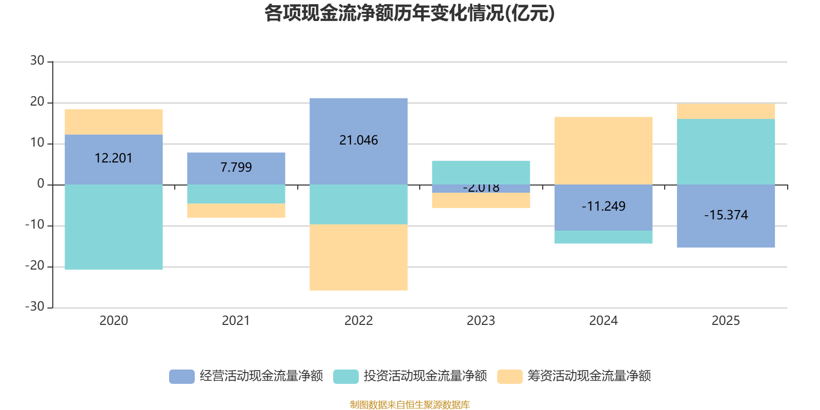 2025年,公司经营活动现金流净额为-15.37亿元,同比减少4.12亿元;筹资活动现金流净额3.69亿元,同比减少12.79亿元;投资活动现金流净额16亿元,上年同期为-3.15亿元。