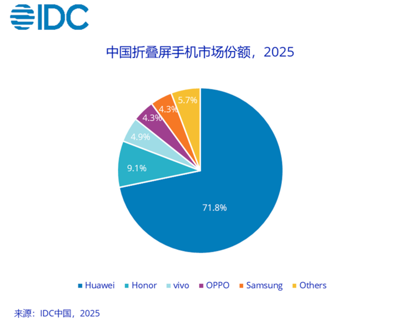 根据IDC数据,2025年全年,中国折叠屏手机市场保持同比增长9.2%,出货量约1001万台。其中,华为折叠机以71.8%的市场份额断层领先;Magic V5系列延续上一代的成功,帮助荣耀以9.1%的市场份额在折叠屏手机市场稳居第二位;其次是vivo、OPPO和三星。