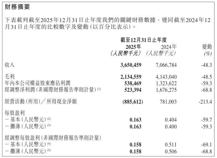 3月25日,珍酒李渡(06979.HK)发布截至2025年12月31日止年度的业绩公告。公司在此期间的收入为36.5亿元,较2024年的70.67亿元下降48.3%,几乎腰斩。毛利也显著下降,录得21.35亿元,下降幅度为48.5%。权益股东应占利润为5.38亿元,同比下降59.3%。经调整净利润5.23 亿元,同比下降 68.8%。