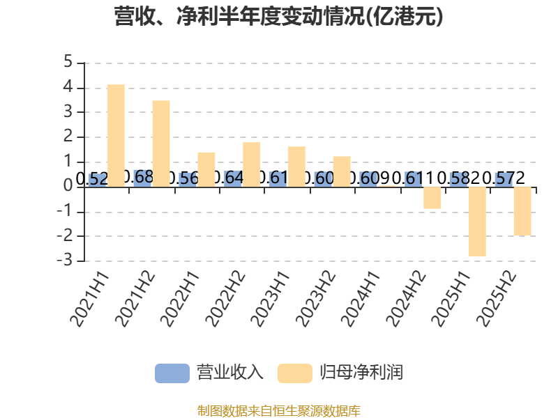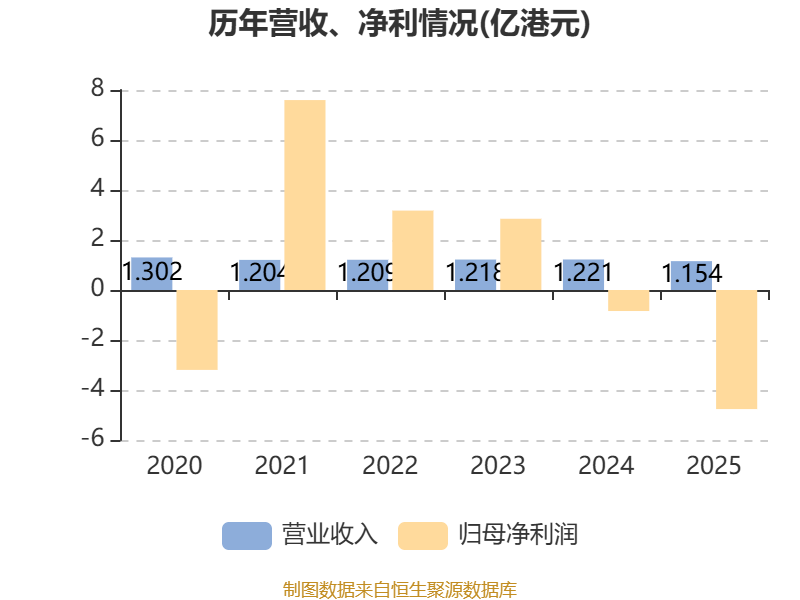 中证智能财讯长城环亚控股(00583)3月26日披露2025年度报告。报告期内,公司实现营业收入1.15亿港元,同比下降5.44%;归母净利润亏损4.76亿港元,上年同期亏损8413.8万港元;据报告显示,长城环亚控股基本每股收益为-0.3038港元,平均净资产收益率为-12.95%。