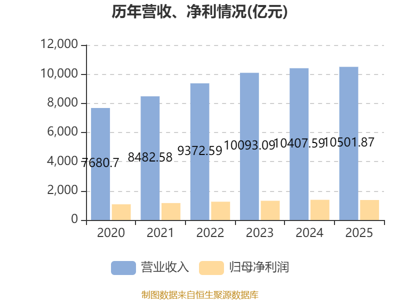 中证智能财讯中国移动(00941)3月26日披露2025年度报告。报告期内,公司实现营业收入10501.87亿元,同比增长0.91%;归母净利润1370.95亿元,同比下降0.92%;经营活动产生的现金流量净额为2329.19亿元,同比下降26.23%;据报告显示,中国移动基本每股收益为6.35元,平均净资产收益率为9.84%。