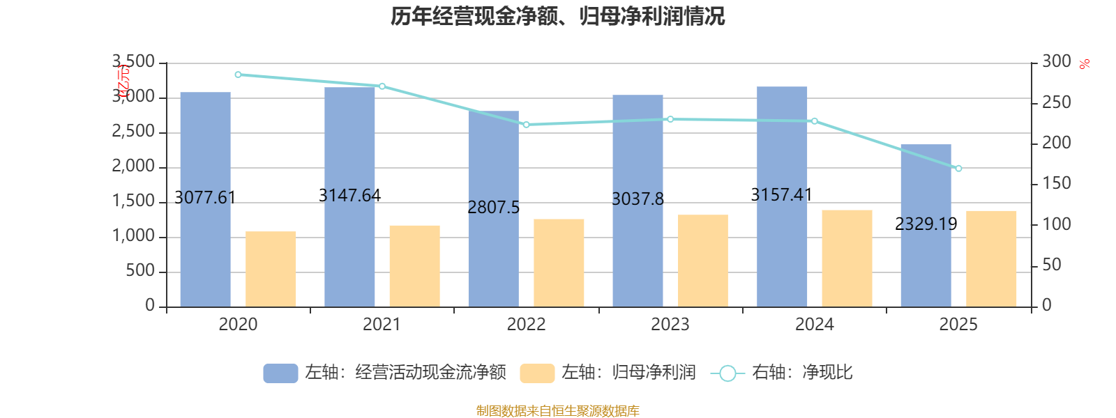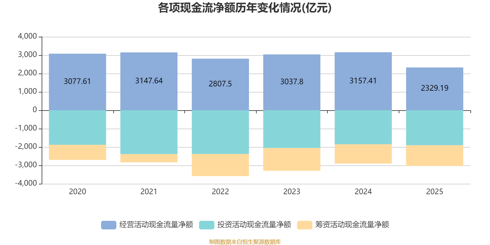 2025年,公司经营活动现金流净额为2329.19亿元,同比下降26.23%;筹资活动现金流净额-1121.43亿元,同比减少69.76亿元;投资活动现金流净额-1904.03亿元,上年同期为-1851.94亿元。