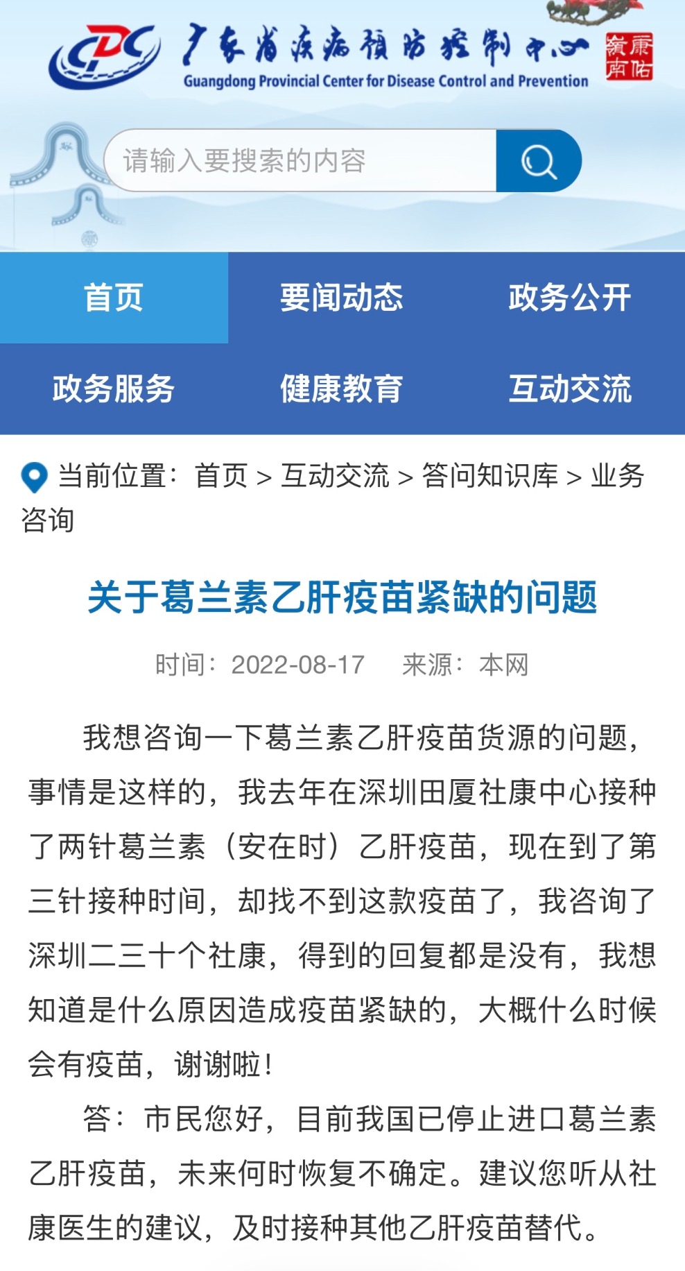 2022年8月,有网友向广东省疾病预防控制中心咨询安在时货源紧缺的问题,彼时该疾控中心回复称,我国已停止进口葛兰素乙肝疫苗,未来何时恢复不确定。