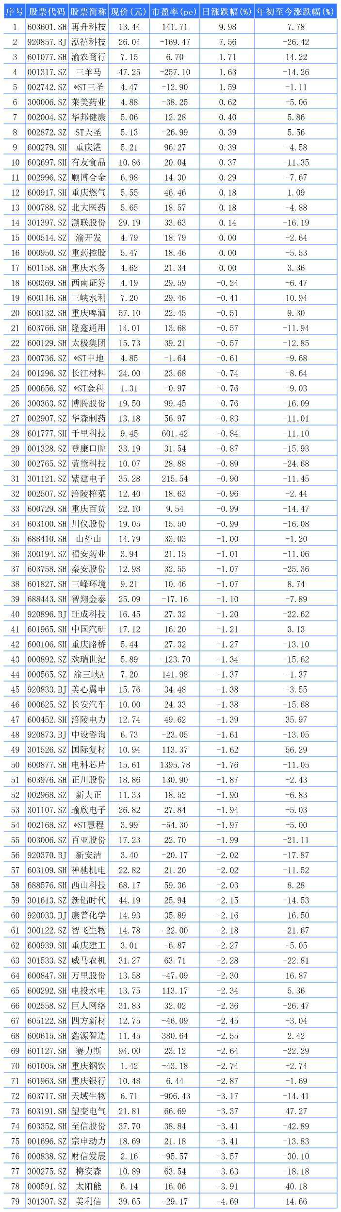 79家重庆A股上市公司中,14家上涨,3家平收,62家下跌。