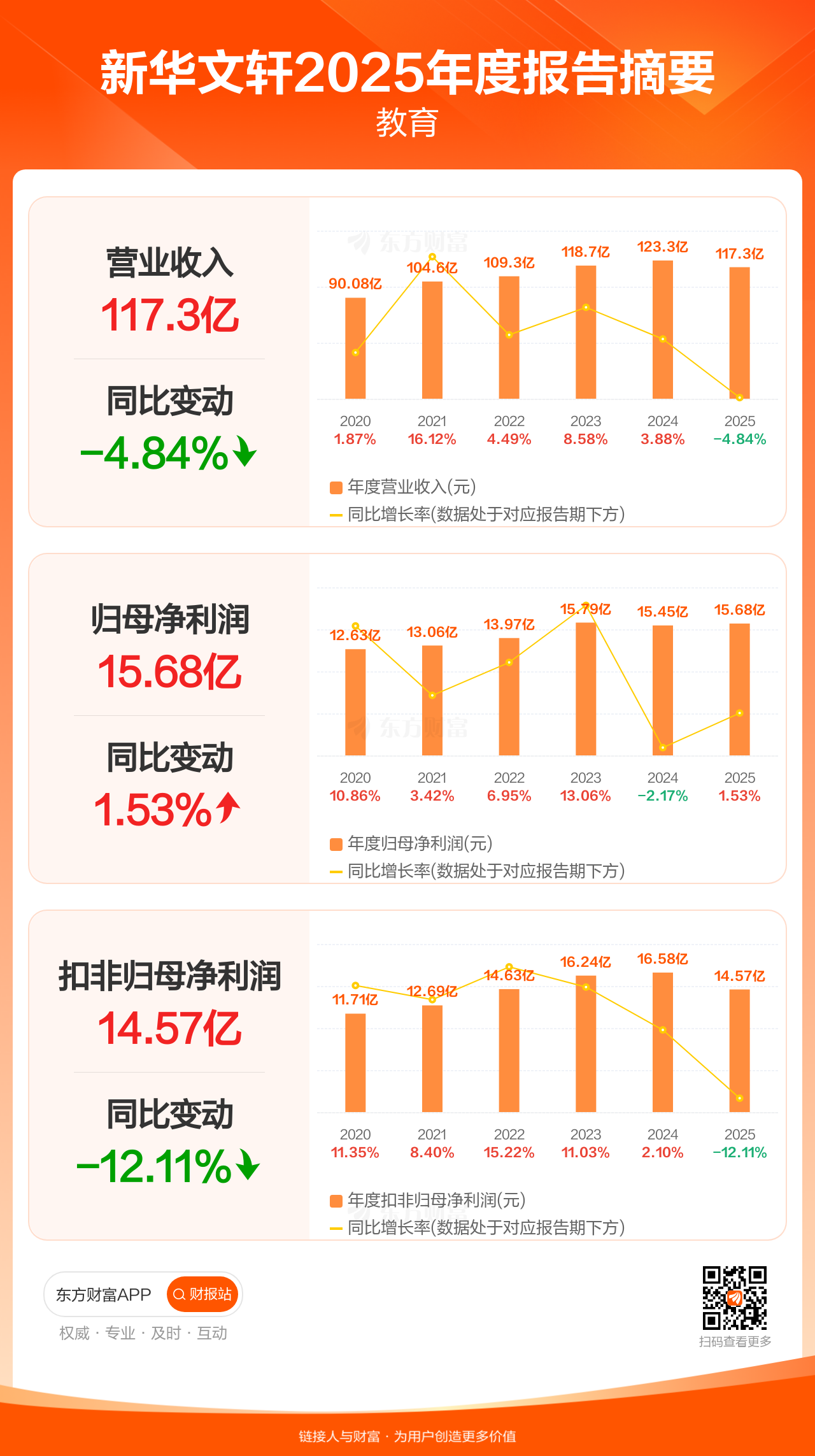 新华文轩3月27日发布2025年年报显示,公司全年实现营业收入117.32亿元,同比下滑4.84%;归母净利润15.68亿元,同比增长1.53%;扣非归母净利润14.57亿元,同比下滑12.11%。每股EPS1.27元,低于机构一致预测的1.42元。