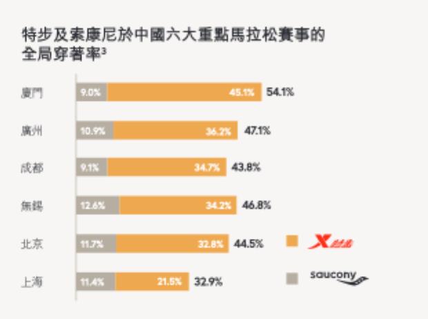 特步主品牌凭借“国人竞速”计划和冠军家族矩阵,牢牢占据“大众专业”跑者的心智;索康尼则瞄准“高端精英”市场,服务追求品牌历史、顶级产品与圈层体验的中产消费者。与其他头部竞对收购国际品牌拓宽品类不同,特步收购索康尼意在向优势领域纵向延伸,强化集团在跑步领域的统治力。数据显示,特步及索康尼在中国六大重点马拉松赛事的全局穿着率高达32.9-54.1%。