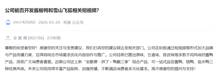 是否推出酱板鸭和雪山飞狐短视频?全聚德回应