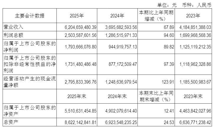 【大河财立方消息】3月26日晚间,“游戏茅”吉比特(603444.SH)发布年报报告称,2025年公司实现营业收入62.05亿元,同比增长67.89%,实现净利润17.94亿元,同比增长89.82%。