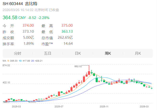 股价方面,2025年以来,吉比特经历了一次快速上涨,期间最大累计涨幅约200%。截至2026年3月26日收盘,吉比特股价报364.58元,最新市值263亿元。