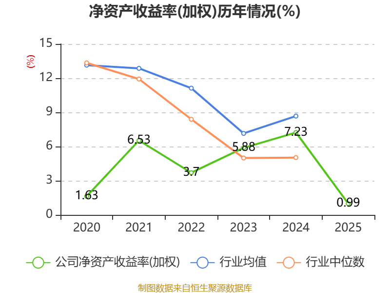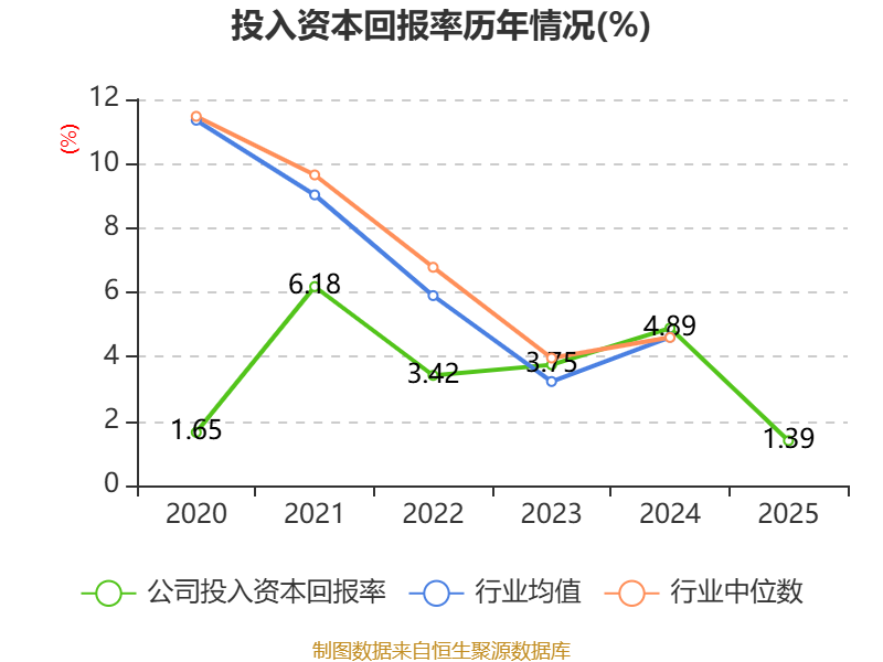 数据显示,2025年公司加权平均净资产收益率为0.99%,较上年同期下降6.24个百分点。公司2025年投入资本回报率为1.39%,较上年同期下降3.5个百分点。