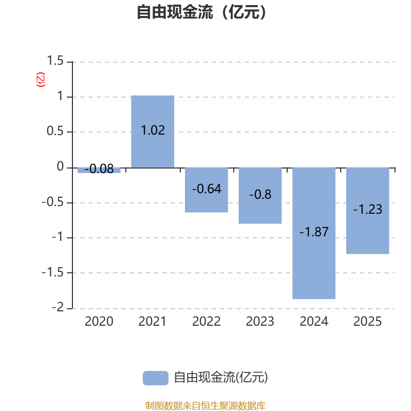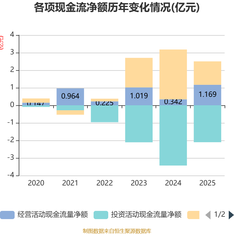 截至2025年,公司经营活动现金流净额为1.17亿元,同比增长241.56%;筹资活动现金流净额1.33亿元,同比减少1.5亿元;投资活动现金流净额-2.1亿元,上年同期为-3.43亿元。