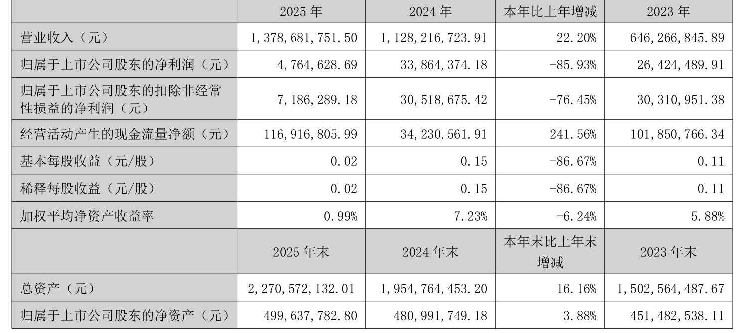 中证智能财讯天津普林(002134)3月27日披露2025年年度报告。2025年,公司实现营业总收入13.79亿元,同比增长22.20%;归母净利润476.46万元,同比下降85.93%;扣非净利润718.63万元,同比下降76.45%;经营活动产生的现金流量净额为1.17亿元,同比增长241.56%;报告期内,天津普林基本每股收益为0.02元,加权平均净资产收益率为0.99%。