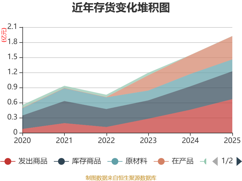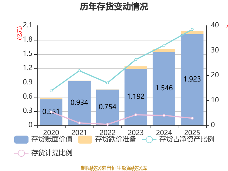 从存货变动来看,截至2025年末,公司存货账面价值为1.92亿元,占净资产的38.49%,较上年末增加3774.98万元。其中,存货跌价准备为573.29万元,计提比例为2.89%。