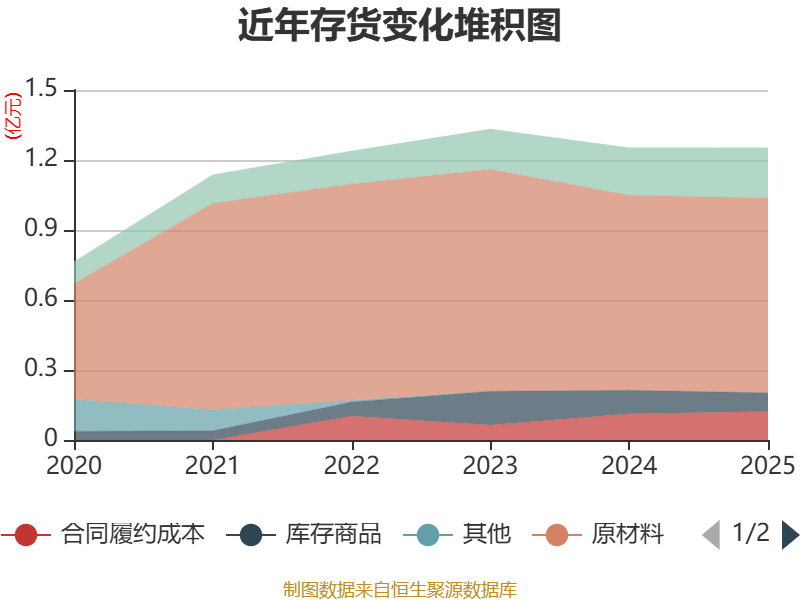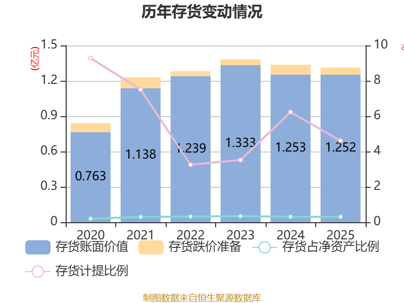 从存货变动来看,截至2025年末,公司存货账面价值为1.25亿元,占净资产的0.31%,较上年末减少8.58万元。其中,存货跌价准备为605.71万元,计提比例为4.61%。