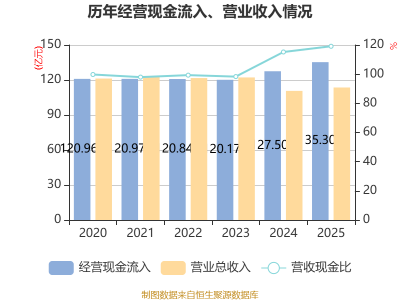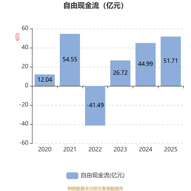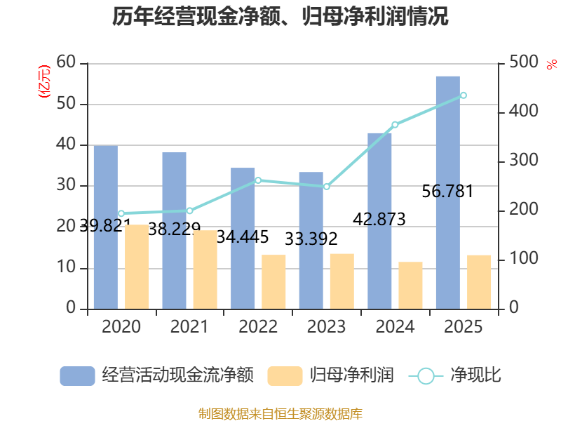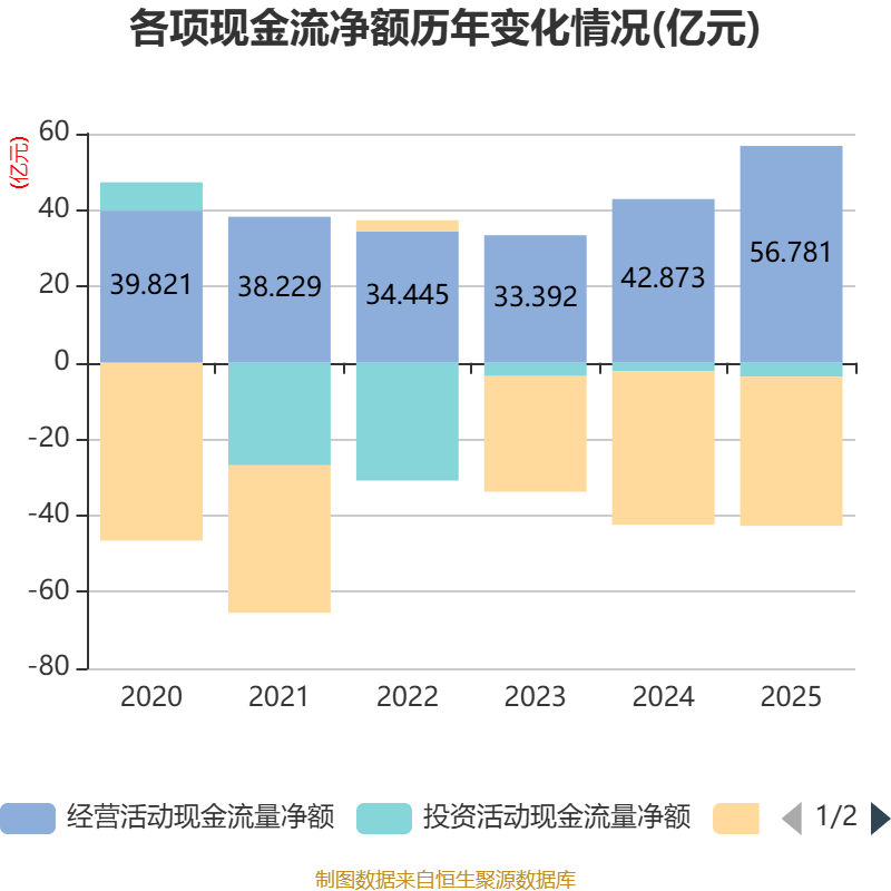 截至2025年,公司经营活动现金流净额为56.78亿元,同比增长32.44%;筹资活动现金流净额-39.04亿元,同比增加1.17亿元;投资活动现金流净额-3.66亿元,上年同期为-2.21亿元。
