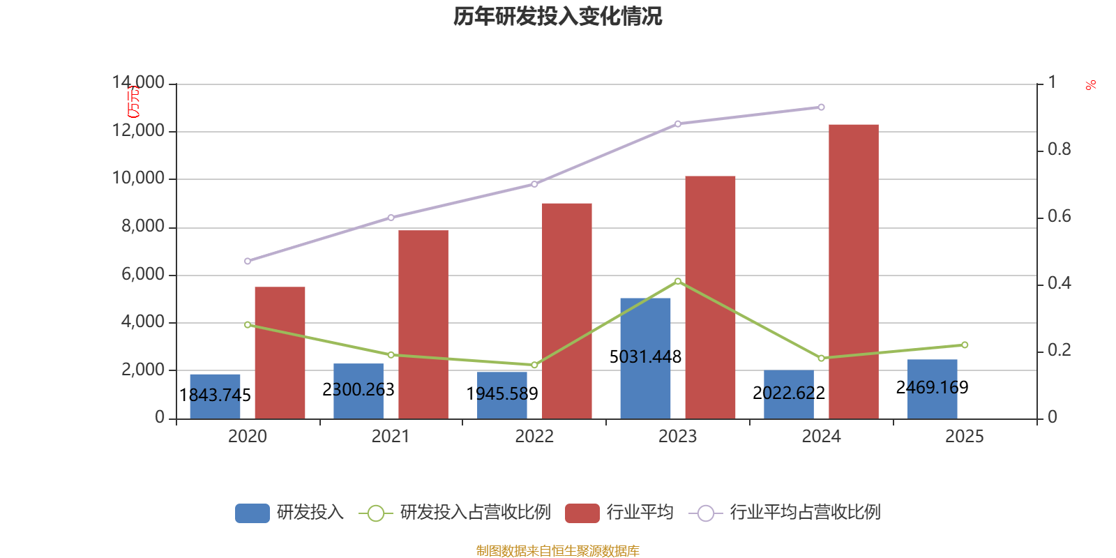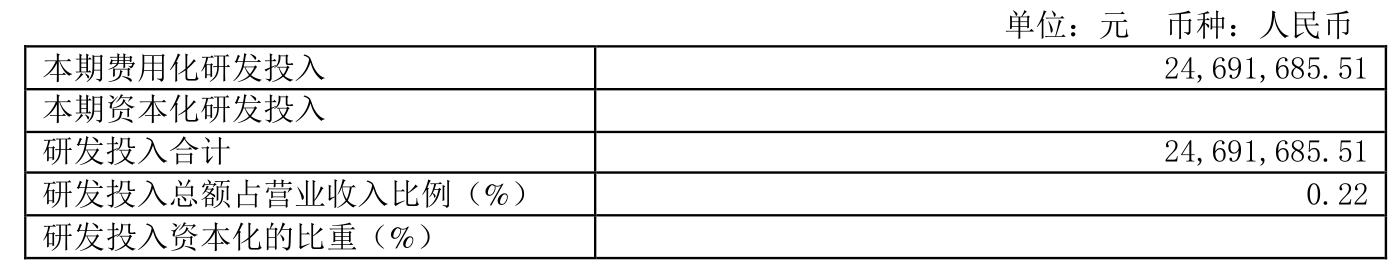 2025年全年,公司研发投入金额为2469.17万元,同比增长22.08%;研发投入占营业收入比例为0.22%,相比上年同期上升0.04个百分点。此外,公司全年研发投入资本化率为0%。