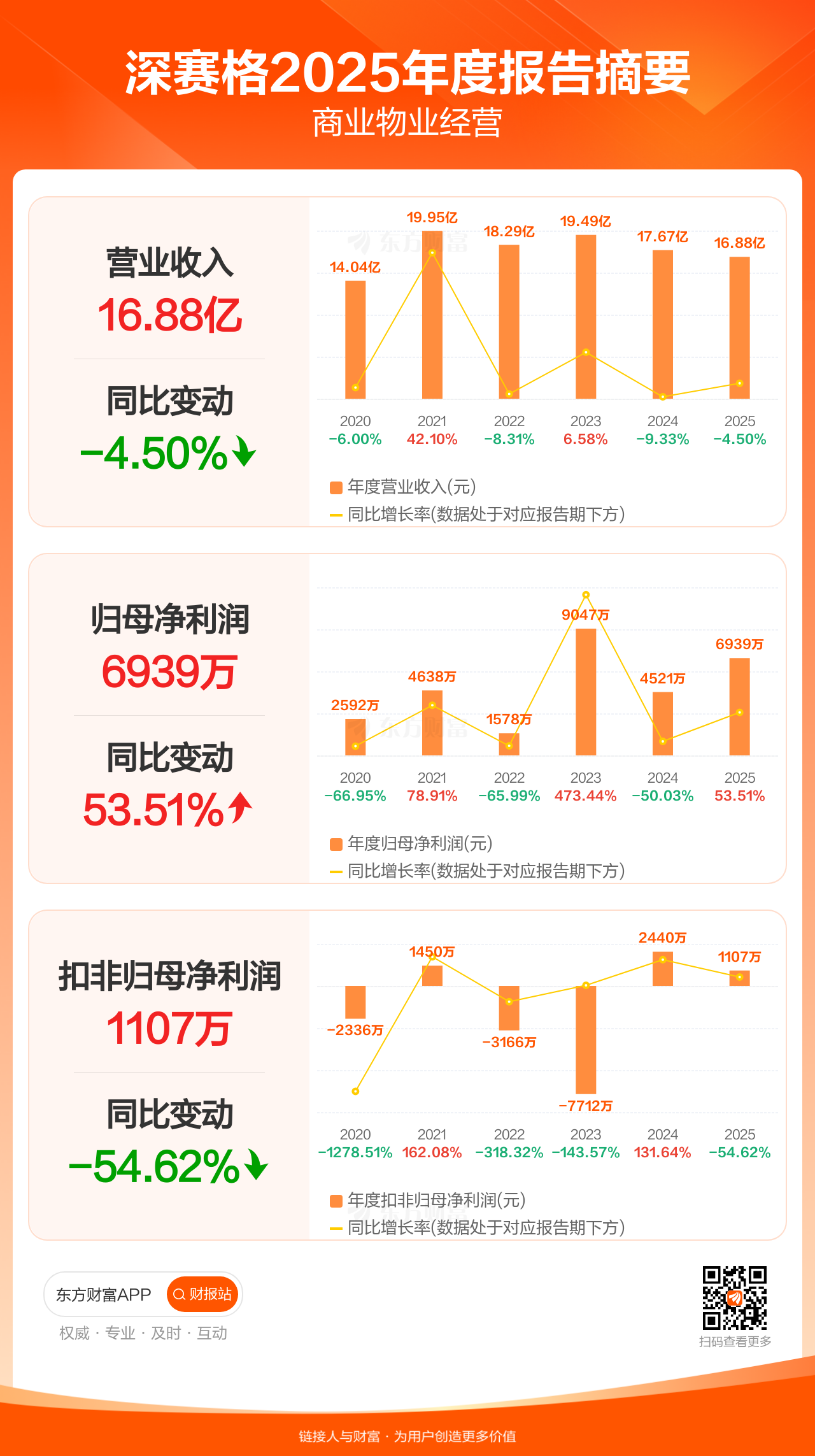 深赛格3月27日发布2025年年报显示,公司全年实现营业收入16.88亿元,同比下滑4.50%;归母净利润6939.47万元,同比增长53.51%;扣非归母净利润1107.33万元,同比下滑54.62%。