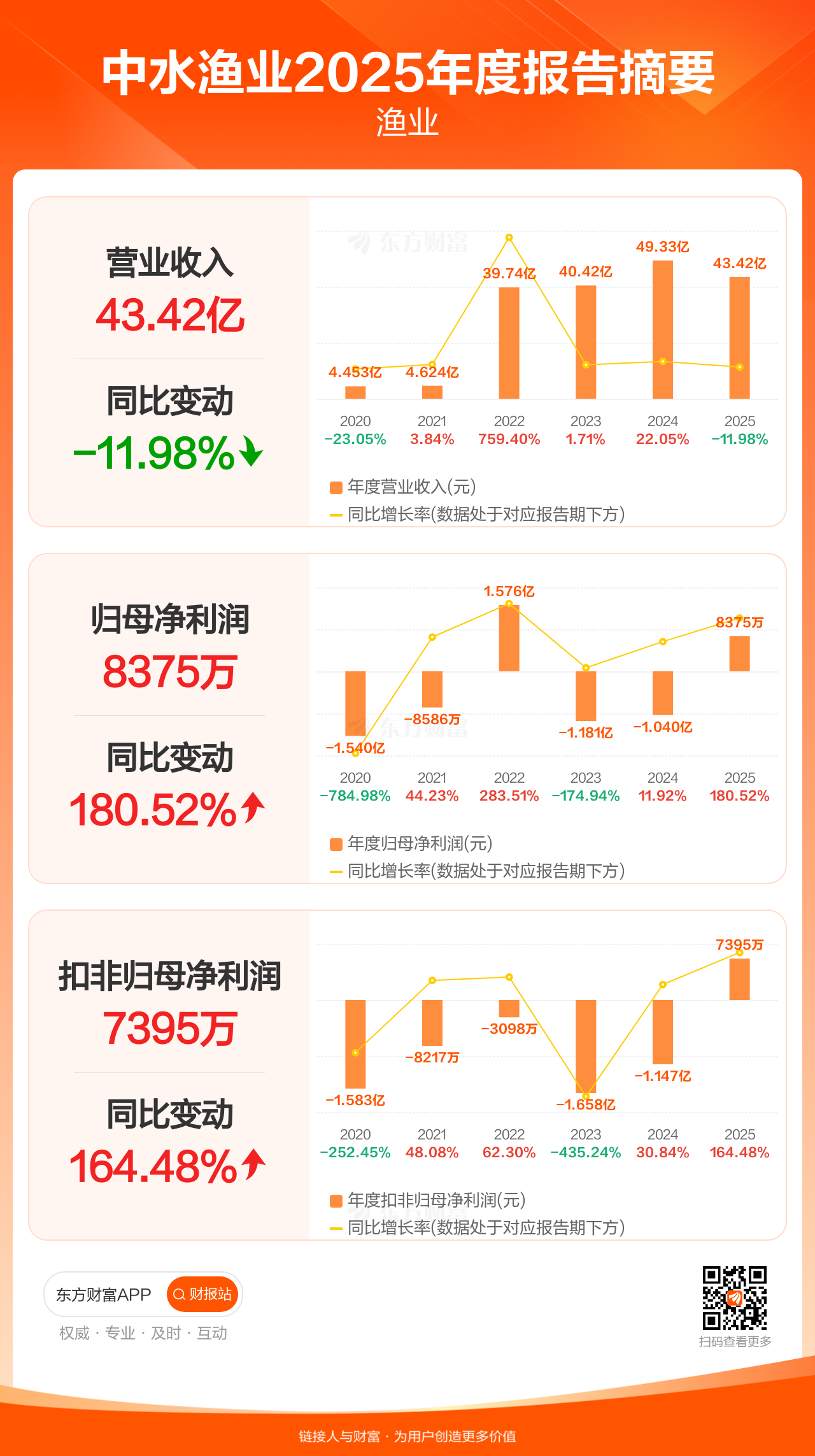 中水渔业3月27日发布2025年年报显示,公司全年实现营业收入43.42亿元,同比下滑11.98%;归母净利润8375.42万元,同比增长180.52%;扣非归母净利润7394.58万元,同比增长164.48%。