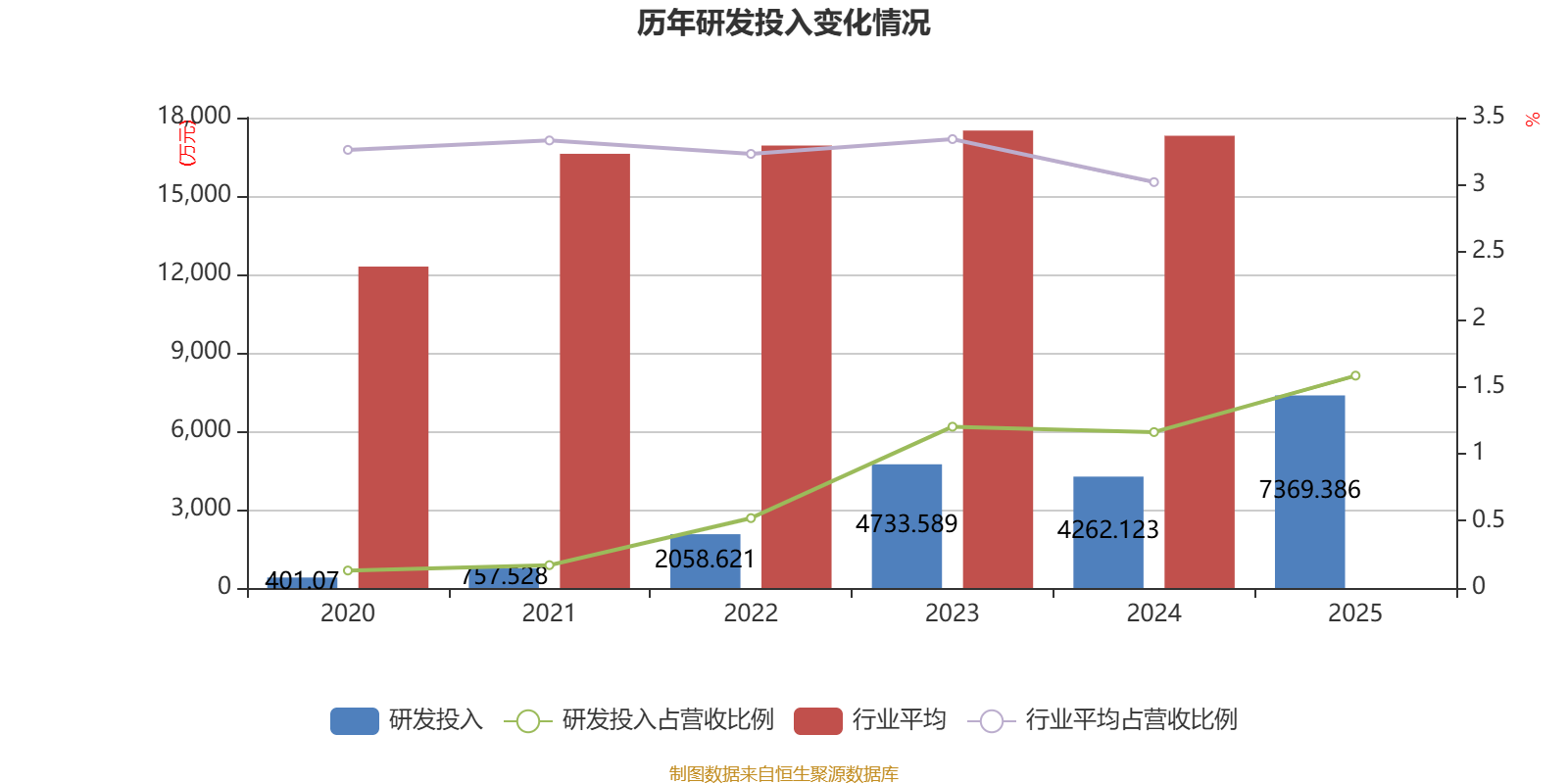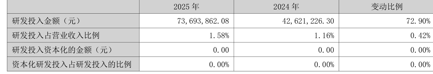 2025年全年,公司研发投入金额为7369.39万元,同比增长72.9%;研发投入占营业收入比例为1.58%,相比上年同期上升0.42个百分点。此外,公司全年研发投入资本化率为0%。