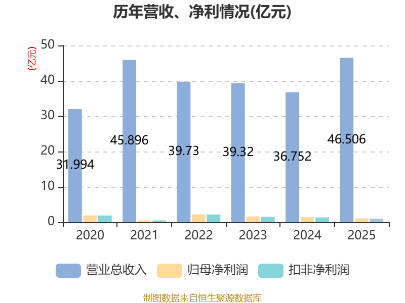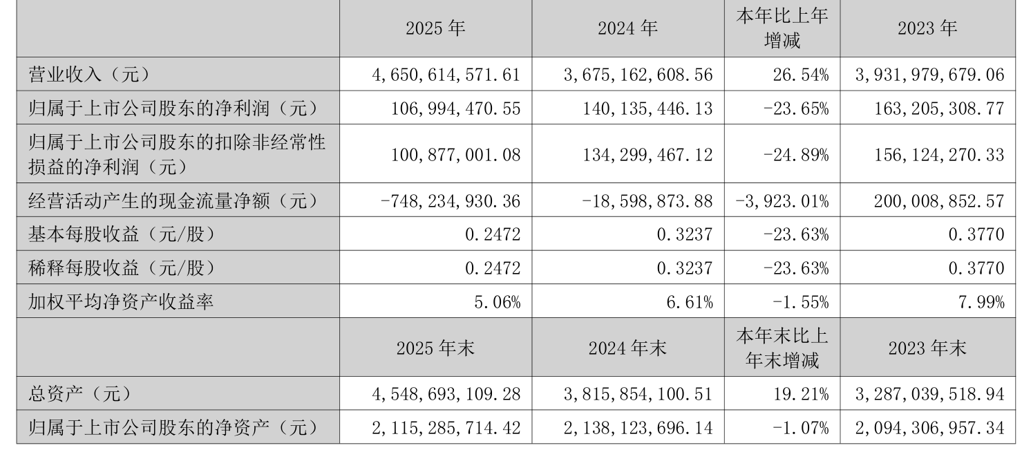 中证智能财讯金龙羽(002882)3月27日披露2025年年度报告。2025年,公司实现营业总收入46.51亿元,同比增长26.54%;归母净利润1.07亿元,同比下降23.65%;扣非净利润1.01亿元,同比下降24.89%;经营活动产生的现金流量净额为-7.48亿元,上年同期为-1859.89万元;报告期内,金龙羽基本每股收益为0.2472元,加权平均净资产收益率为5.06%。公司2025年度分配预案为:拟向全体股东每10股派现1元(含税)。