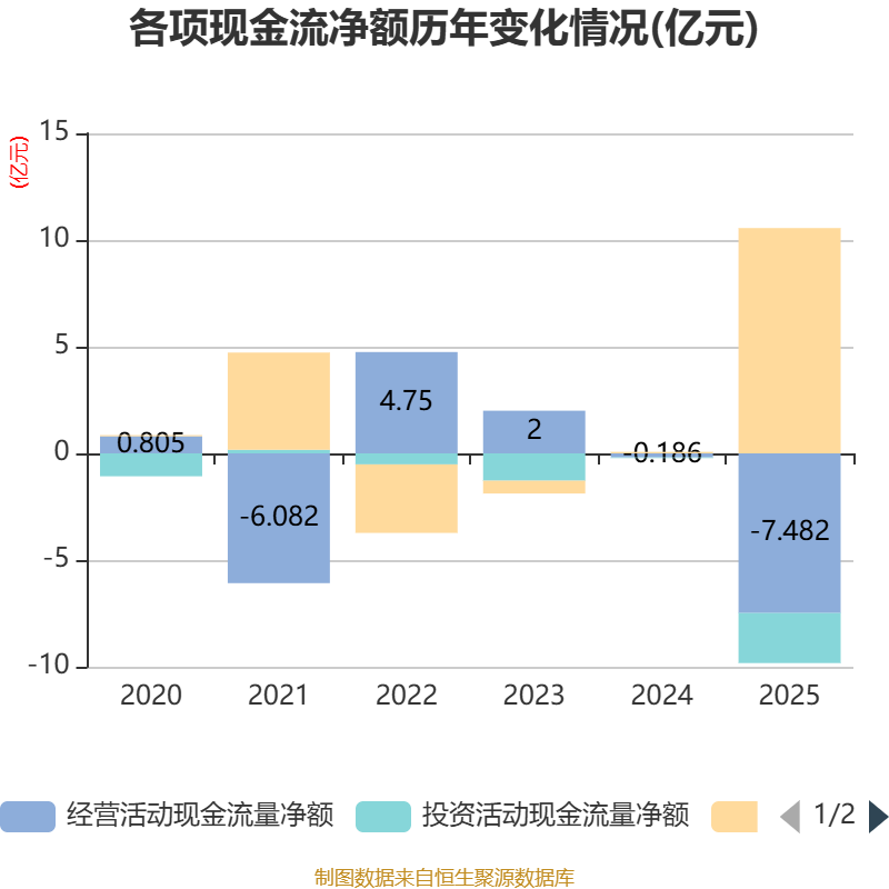截至2025年,公司经营活动现金流净额为-7.48亿元,同比减少7.3亿元;筹资活动现金流净额10.56亿元,同比增加10.49亿元;投资活动现金流净额-2.35亿元,上年同期为-313.01万元。