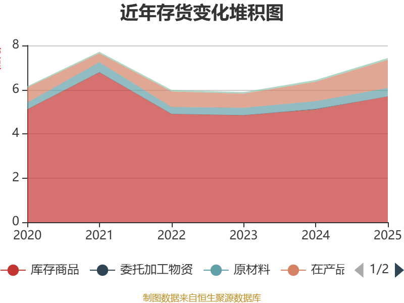 从存货变动来看,截至2025年末,公司存货账面价值为7.43亿元,占净资产的35.11%,较上年末增加9945.65万元。其中,存货跌价准备为610.21万元,计提比例为0.81%。