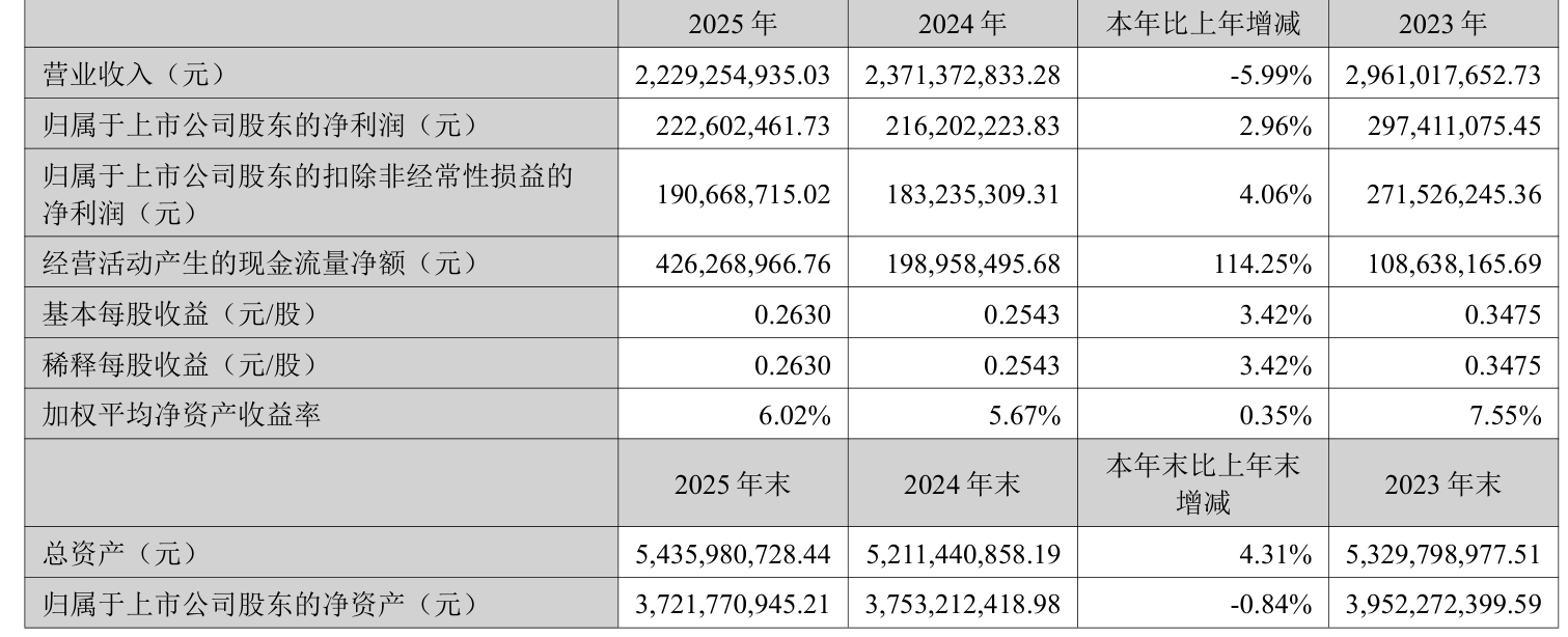 中证智能财讯九芝堂(000989)3月27日披露2025年年度报告。2025年,公司实现营业总收入22.29亿元,同比下降5.99%;归母净利润2.23亿元,同比增长2.96%;扣非净利润1.91亿元,同比增长4.06%;经营活动产生的现金流量净额为4.26亿元,同比增长114.25%;报告期内,九芝堂基本每股收益为0.263元,加权平均净资产收益率为6.02%。公司2025年度分配预案为:拟向全体股东每10股派现3元(含税)。