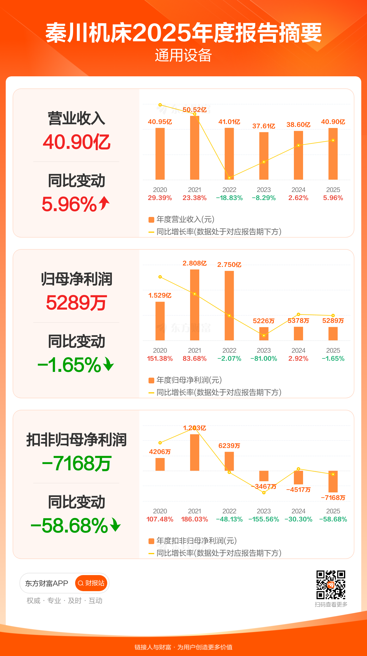 秦川机床3月27日发布2025年年报显示,公司全年实现营业收入40.90亿元,同比增长5.96%;归母净利润5289.38万元,同比下滑1.65%;扣非归母净利润-7167.53万元。每股EPS0.05元,低于机构一致预测的0.09元。