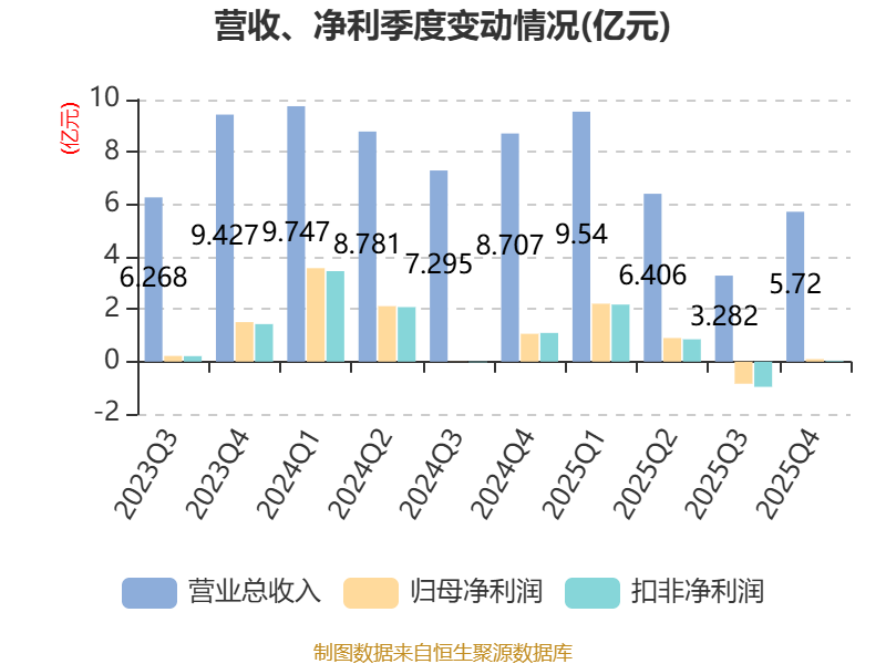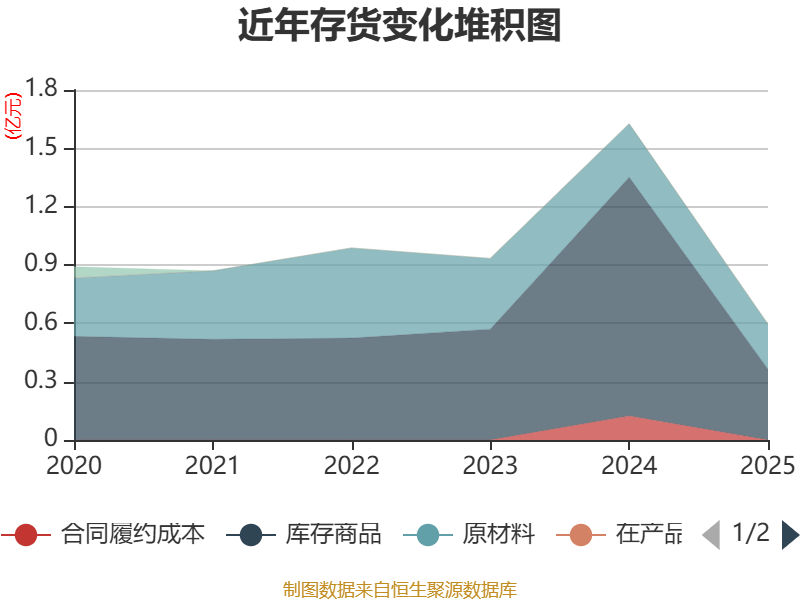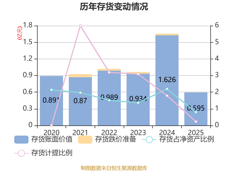 从存货变动来看,截至2025年末,公司存货账面价值为5951.77万元,占净资产的0.8%,较上年末减少1.03亿元。其中,存货跌价准备为13.55万元,计提比例为0.23%。