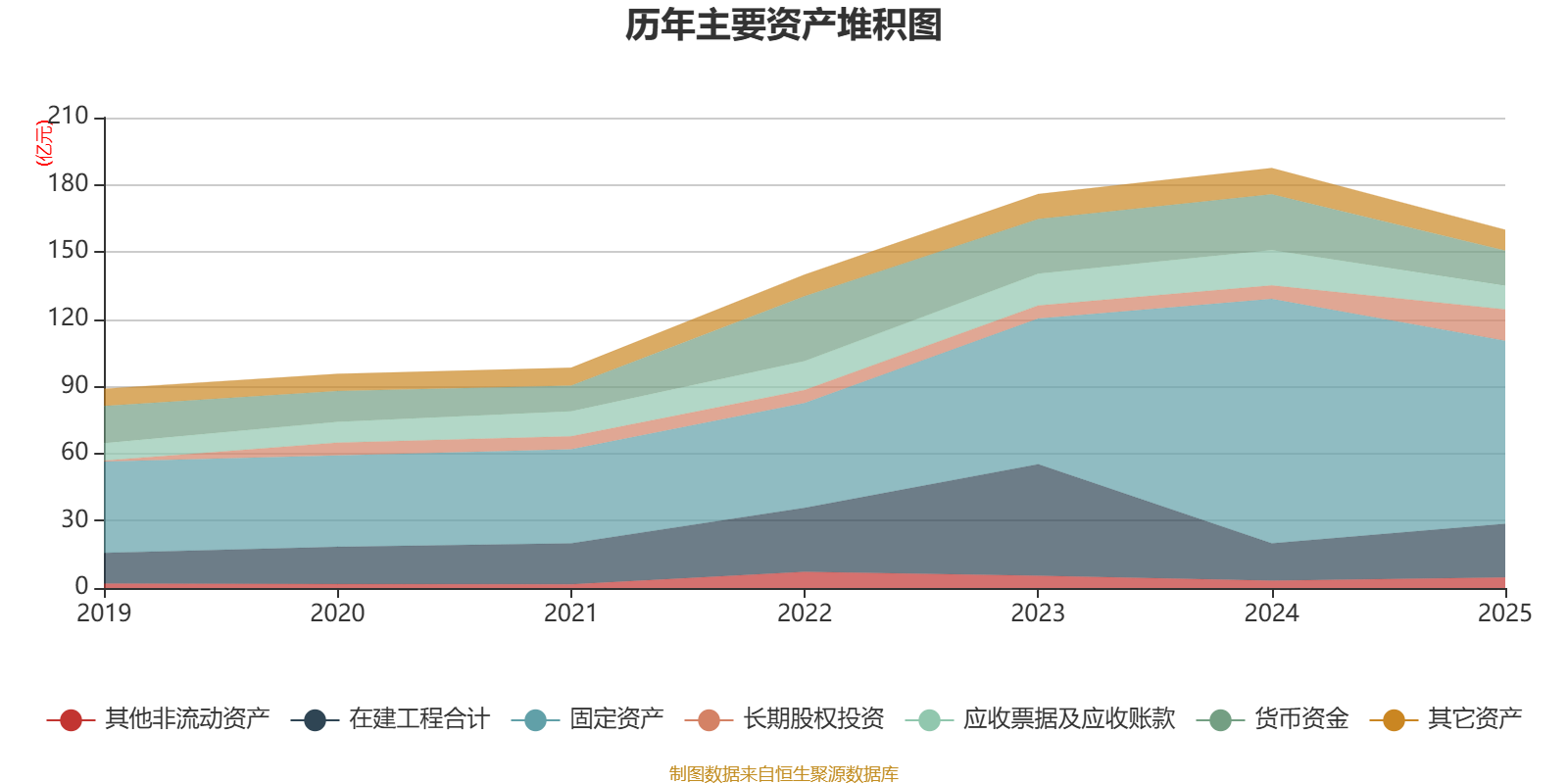 资产重大变化方面,截至2025年末,公司固定资产较上年末减少25.09%,占公司总资产比重下降7.07个百分点;在建工程合计较上年末增加43.68%,占公司总资产比重上升6.09个百分点;长期股权投资较上年末增加132.45%,占公司总资产比重上升5.54个百分点;货币资金较上年末减少37.17%,占公司总资产比重下降3.5个百分点。