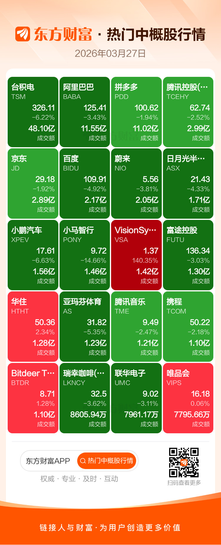 台积电跌6.22%,阿里巴巴跌3.43%,拼多多跌1.94%,腾讯控股(ADR)跌2.52%,京东跌1.92%,百度跌4.92%,蔚来跌3.81%,日月光半导体跌4.33%,小鹏汽车跌6.63%,小马智行跌14.66%。