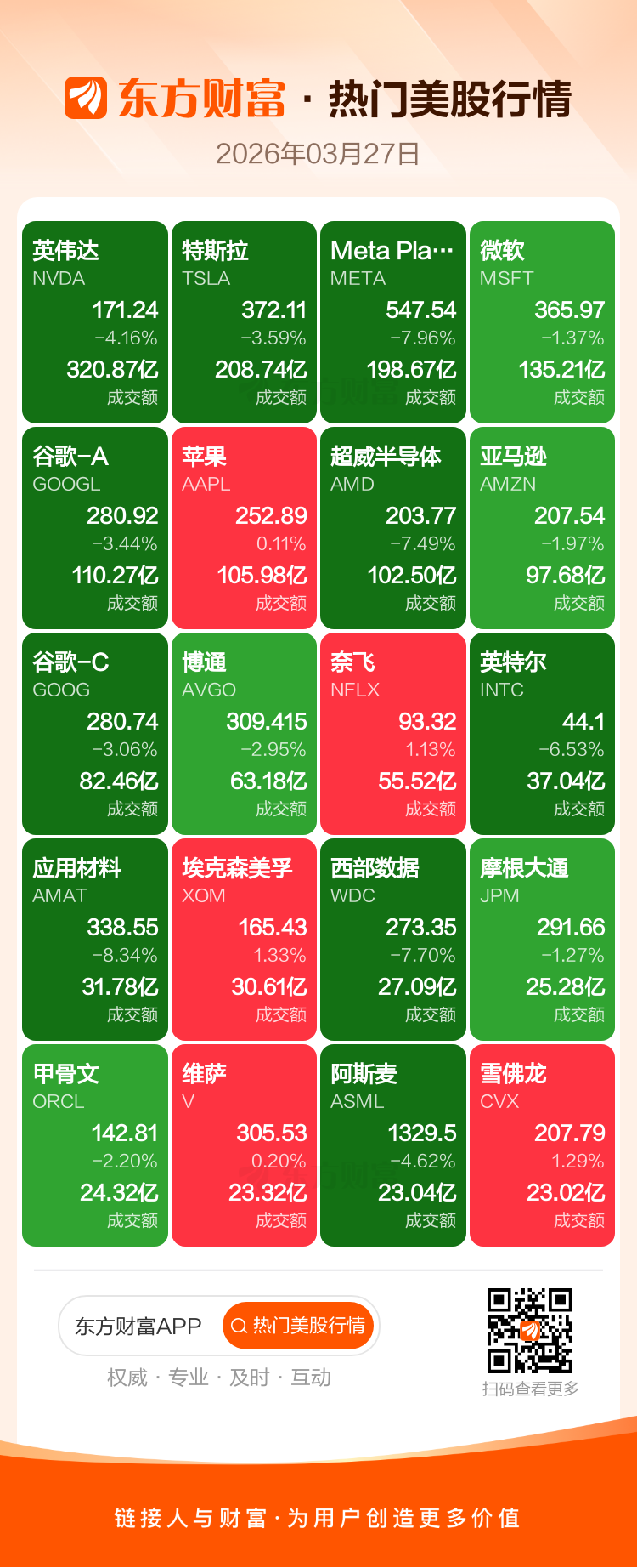 英伟达跌4.16%,特斯拉跌3.59%,Meta Platforms Inc-A跌7.96%,微软跌1.37%,谷歌-A跌3.44%,苹果涨0.11%,超威半导体跌7.49%,亚马逊跌1.97%,谷歌-C跌3.06%,博通跌2.95%。