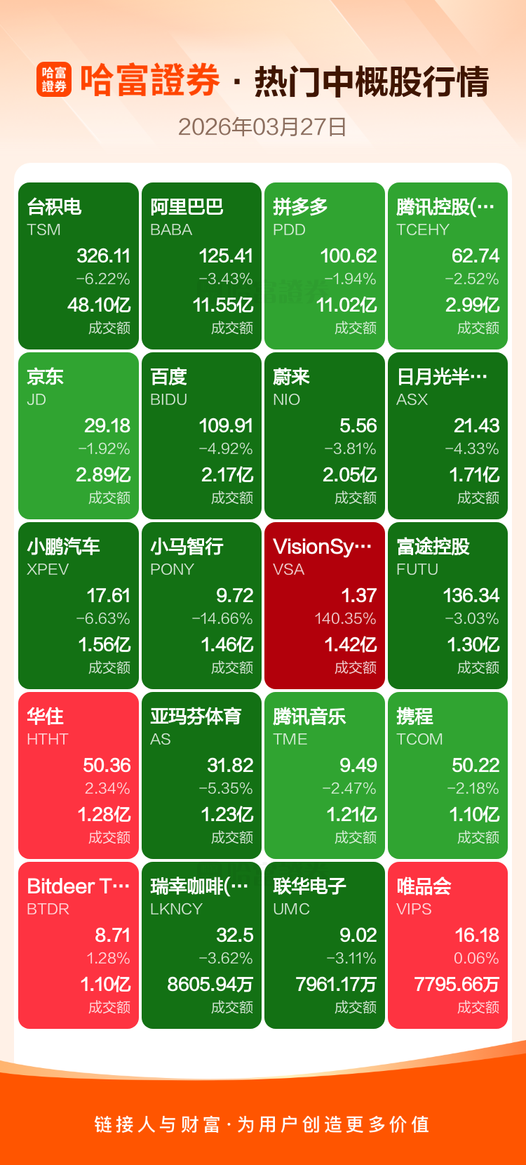 台积电跌6.22%,阿里巴巴跌3.43%,拼多多跌1.94%,腾讯控股(ADR)跌2.52%,京东跌1.92%,百度跌4.92%,蔚来跌3.81%,日月光半导体跌4.33%,小鹏汽车跌6.63%,小马智行跌14.66%。