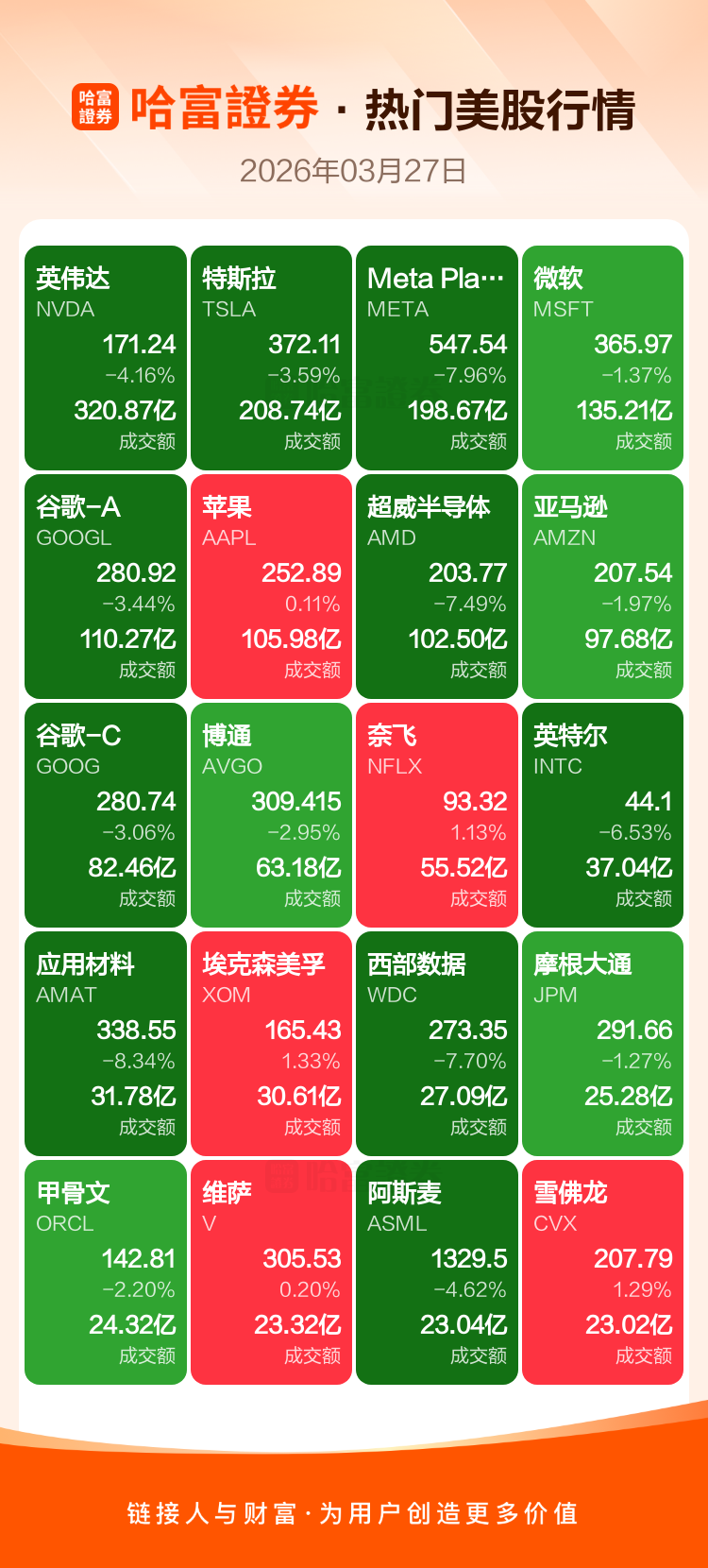 英伟达跌4.16%,特斯拉跌3.59%,Meta Platforms Inc-A跌7.96%,微软跌1.37%,谷歌-A跌3.44%,苹果涨0.11%,超威半导体跌7.49%,亚马逊跌1.97%,谷歌-C跌3.06%,博通跌2.95%。
