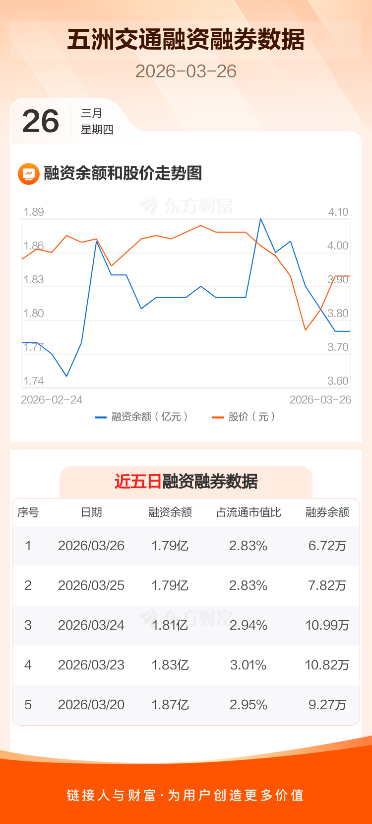 交易所最新数据显示,五洲交通于2026年3月26日获融资买入775.10万元,融资偿还746.99万元,当日融资净买入28.1万元。目前,该股融资余额1.79亿,占流通市值比例为2.83%。