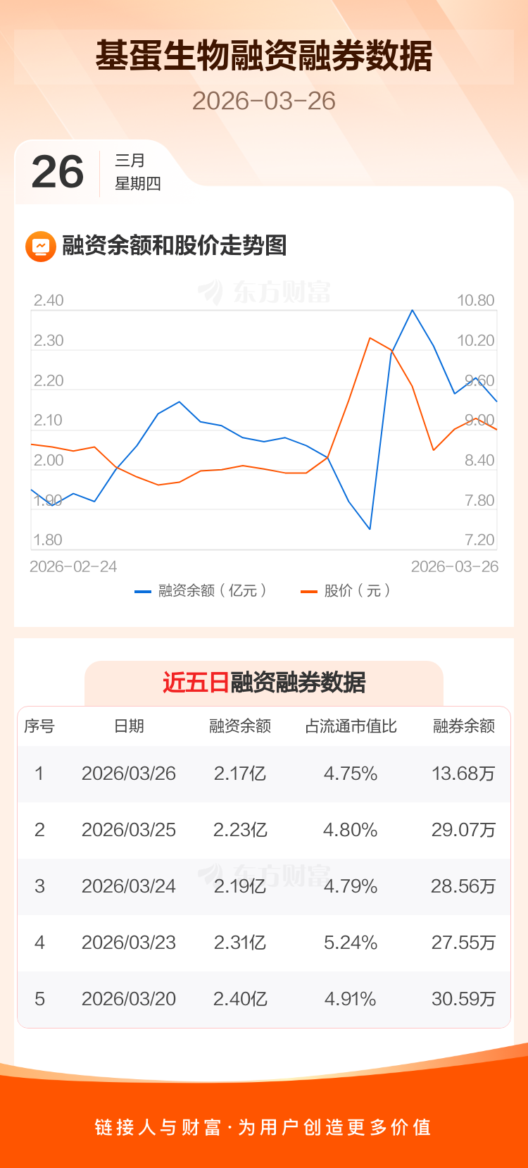 交易所最新数据显示,基蛋生物于2026年3月26日获融资买入1978.47万元,融资偿还2630.84万元,当日融资净偿还652.37万元。目前,该股融资余额2.17亿,占流通市值比例为4.75%。
