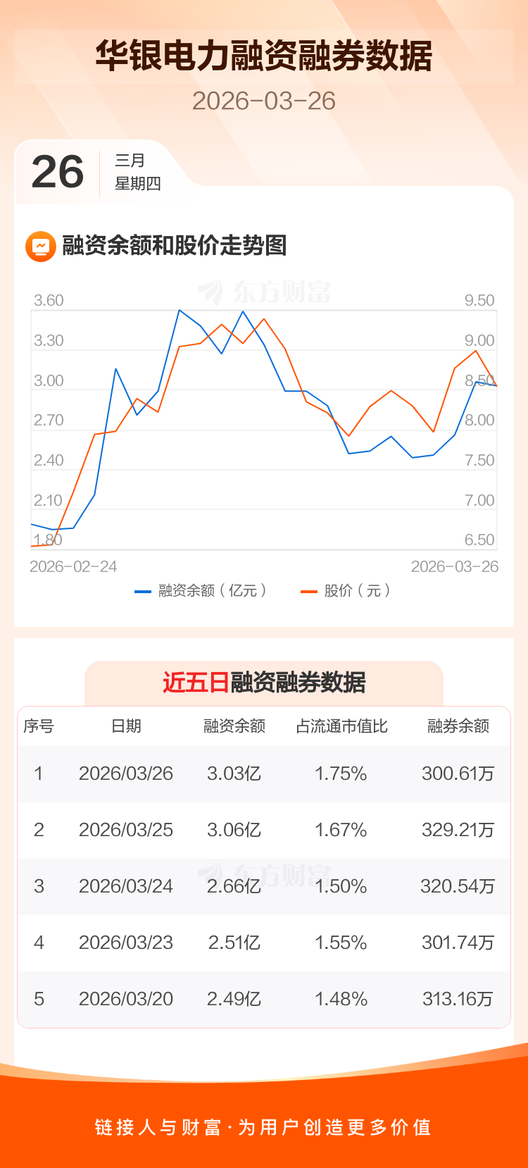 交易所最新数据显示,华银电力于2026年3月26日获融资买入1.19亿元,融资偿还1.21亿元,当日融资净偿还228.5万元。目前,该股融资余额3.03亿,占流通市值比例为1.75%。