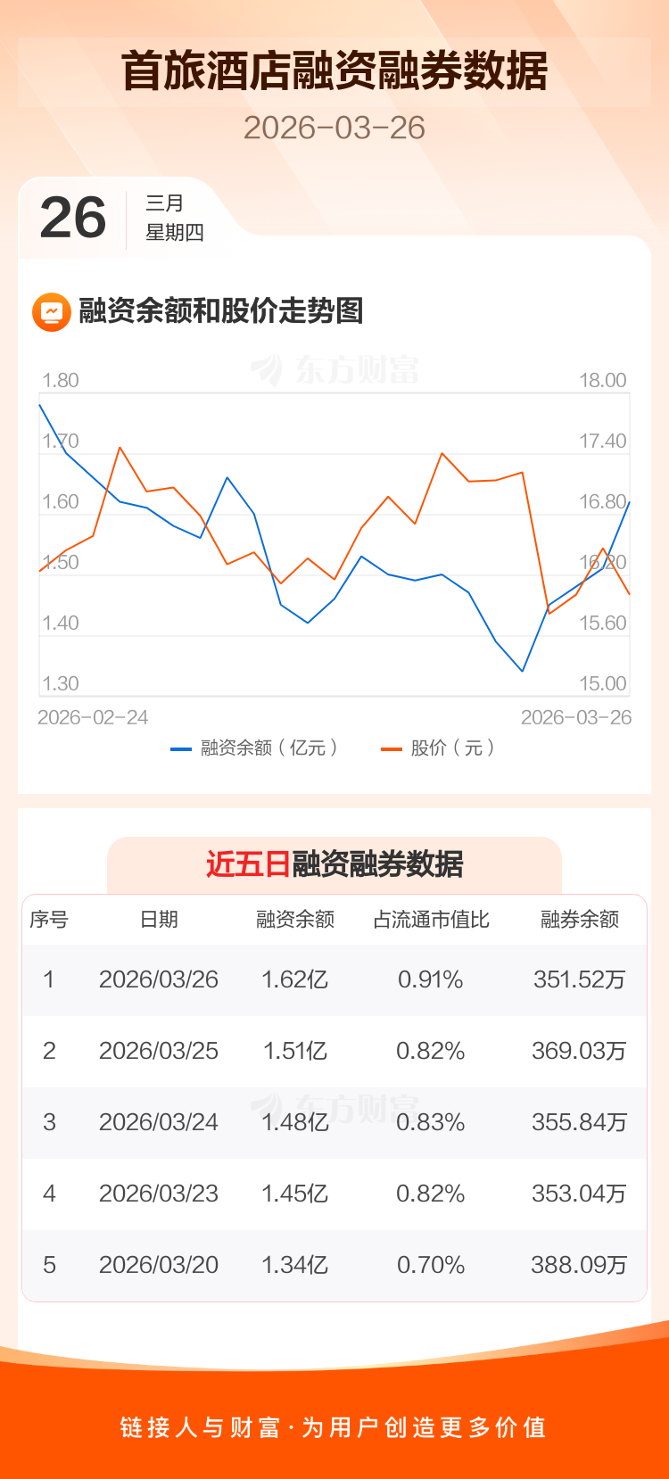 交易所最新数据显示,首旅酒店于2026年3月26日获融资买入1767.22万元,融资偿还655.25万元,当日融资净买入1111.97万元。目前,该股融资余额1.62亿,占流通市值比例为0.91%。