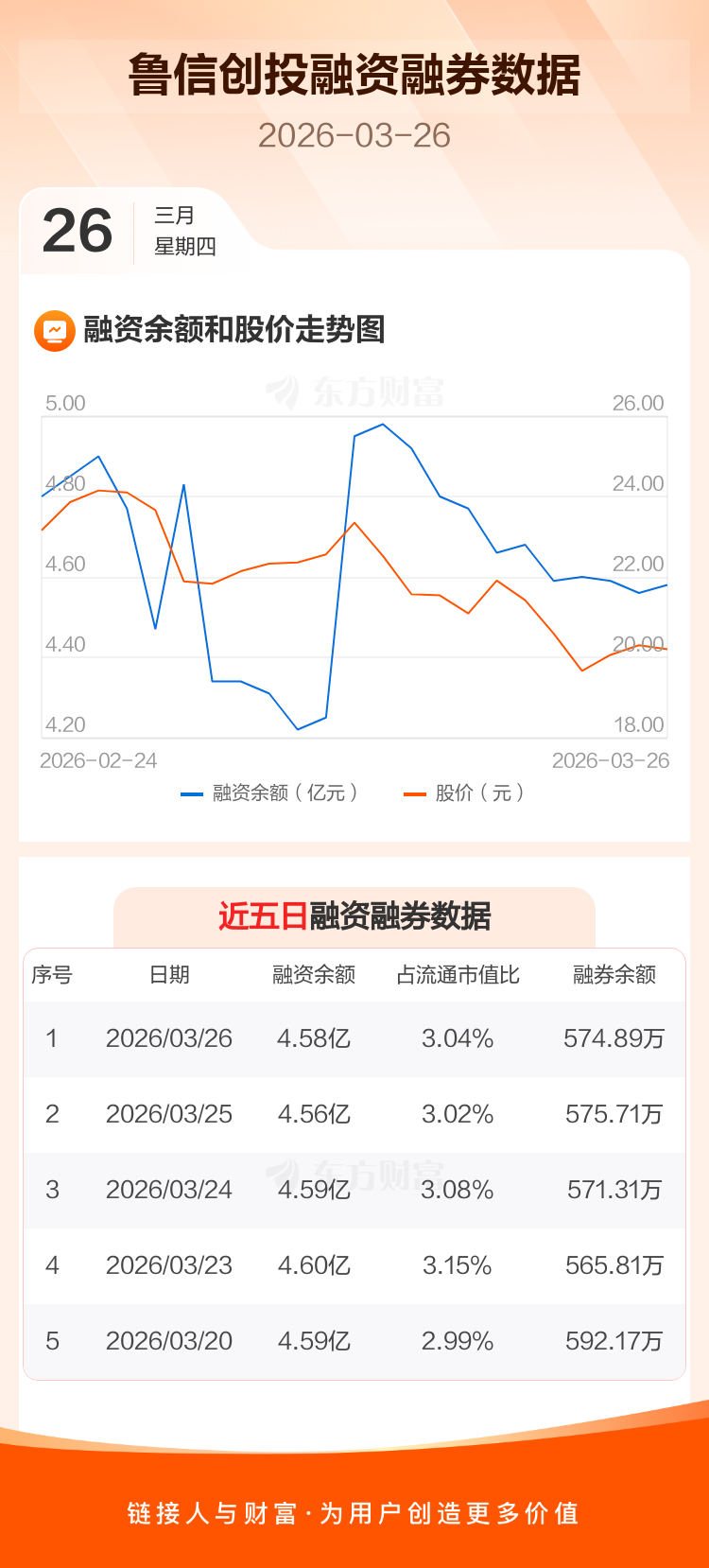 交易所最新数据显示,鲁信创投于2026年3月26日获融资买入1953.97万元,融资偿还1782.85万元,当日融资净买入171.12万元。目前,该股融资余额4.58亿,占流通市值比例为3.04%。