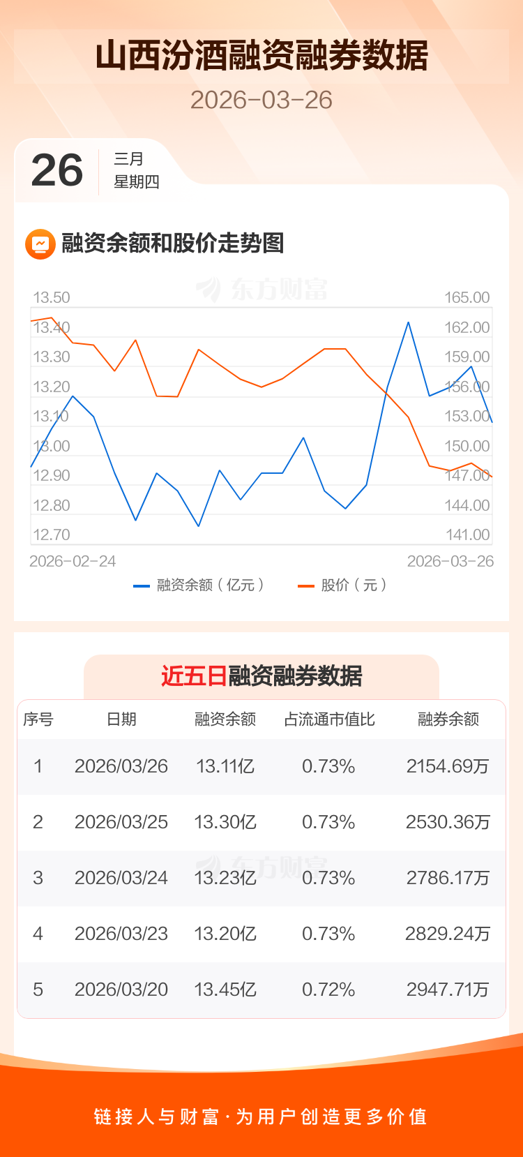 交易所最新数据显示,山西汾酒于2026年3月26日获融资买入5091.10万元,融资偿还6957.70万元,当日融资净偿还1866.6万元。目前,该股融资余额13.11亿,占流通市值比例为0.73%。