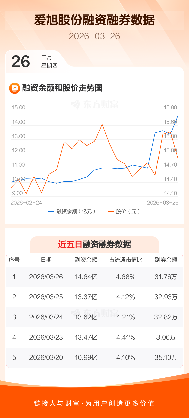 交易所最新数据显示,爱旭股份于2026年3月26日获融资买入2.12亿元,融资偿还8465.27万元,当日融资净买入1.27亿元。目前,该股融资余额14.64亿,占流通市值比例为4.68%。