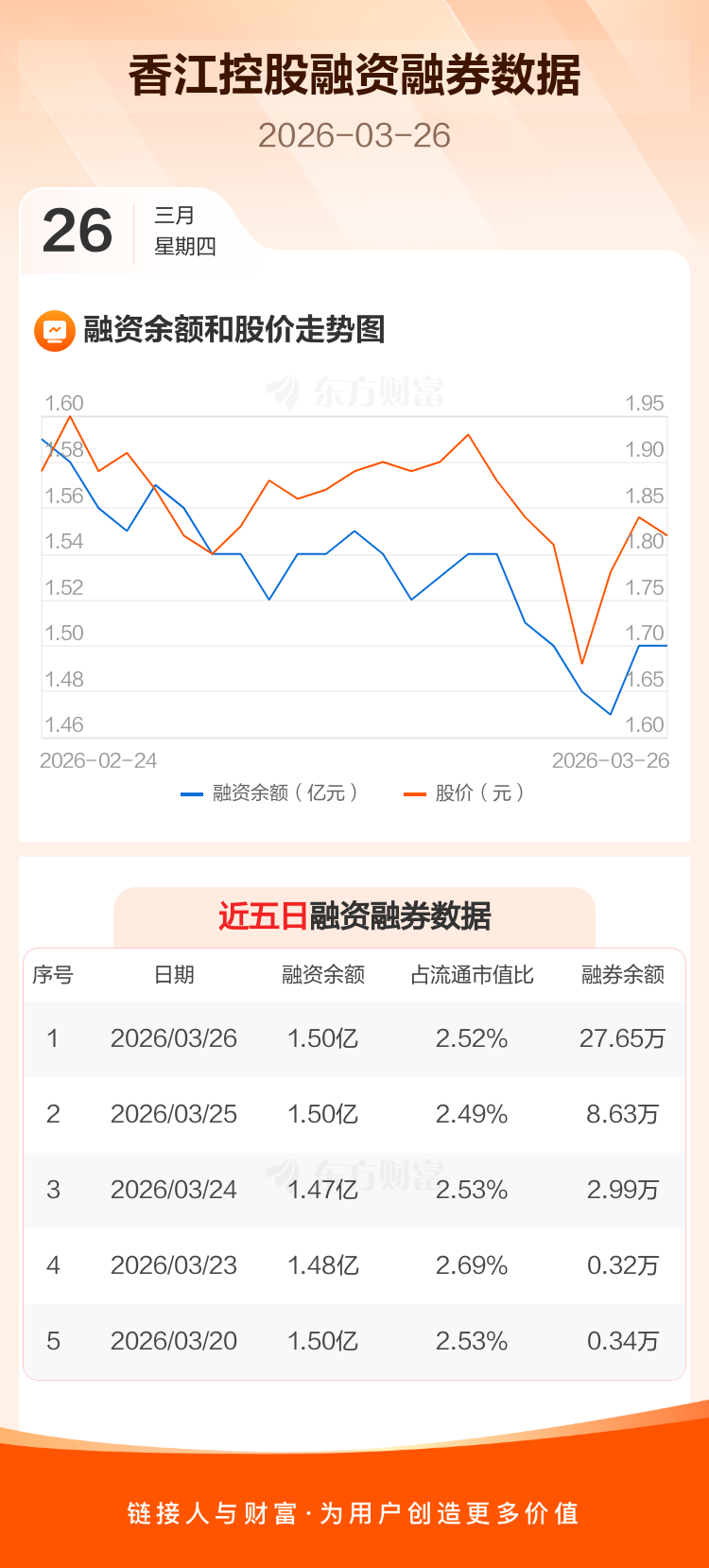 交易所最新数据显示,香江控股于2026年3月26日获融资买入802.19万元,融资偿还805.01万元,当日融资净偿还2.82万元。目前,该股融资余额1.50亿,占流通市值比例为2.52%。