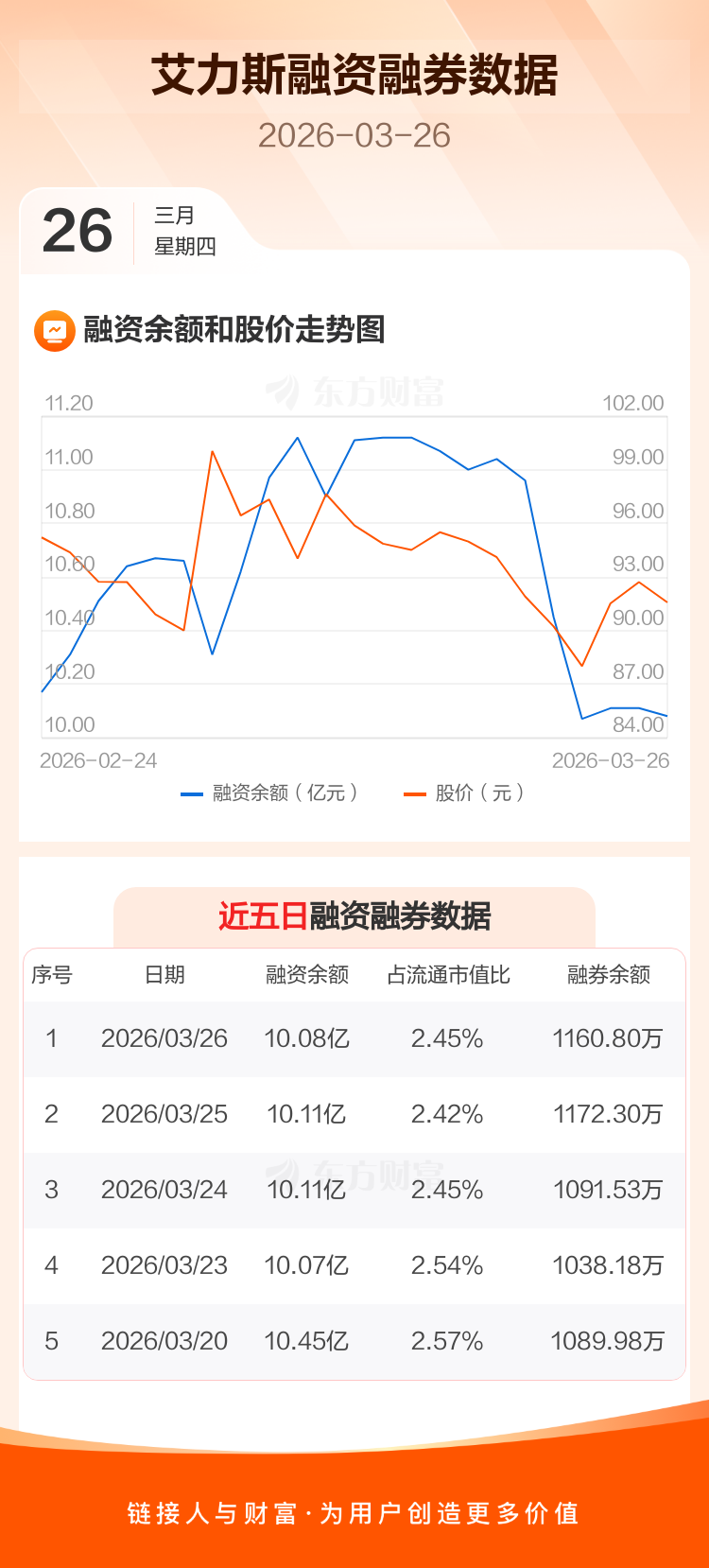 交易所最新数据显示,艾力斯于2026年3月26日获融资买入1333.33万元,融资偿还1569.46万元,当日融资净偿还236.13万元。目前,该股融资余额10.08亿,占流通市值比例为2.45%。