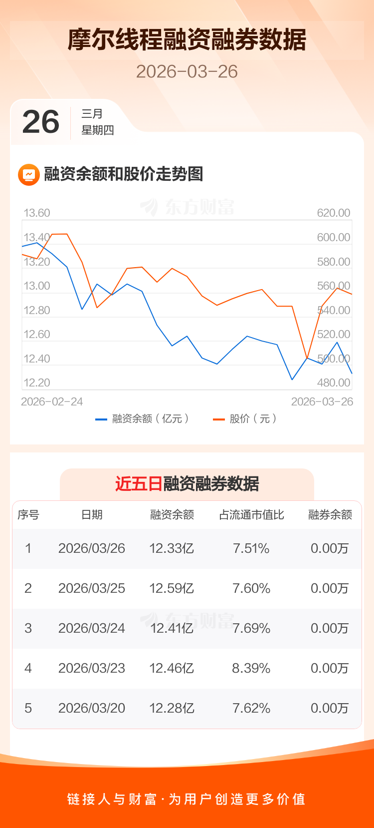 交易所最新数据显示,摩尔线程于2026年3月26日获融资买入8571.08万元,融资偿还1.12亿元,当日融资净偿还2643万元。目前,该股融资余额12.33亿,占流通市值比例为7.51%。