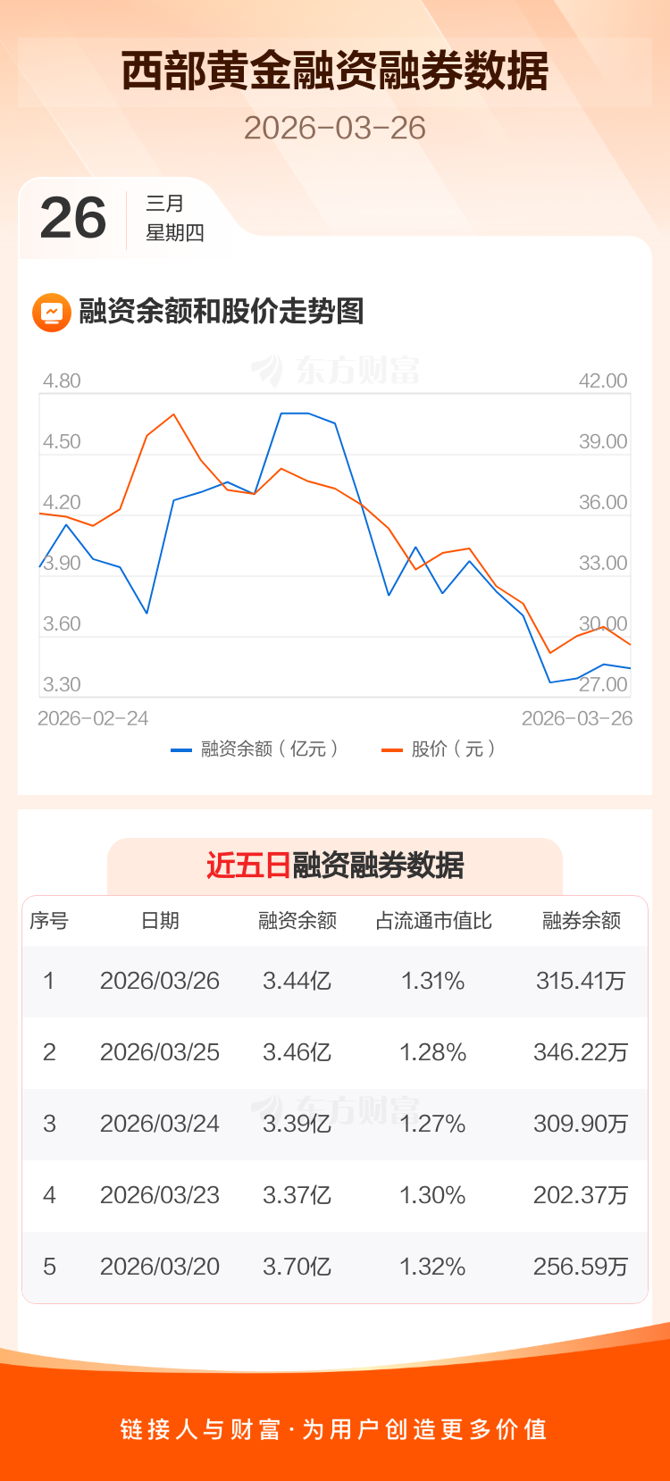 交易所最新数据显示,西部黄金于2026年3月26日获融资买入2531.04万元,融资偿还2736.51万元,当日融资净偿还205.47万元。目前,该股融资余额3.44亿,占流通市值比例为1.31%。