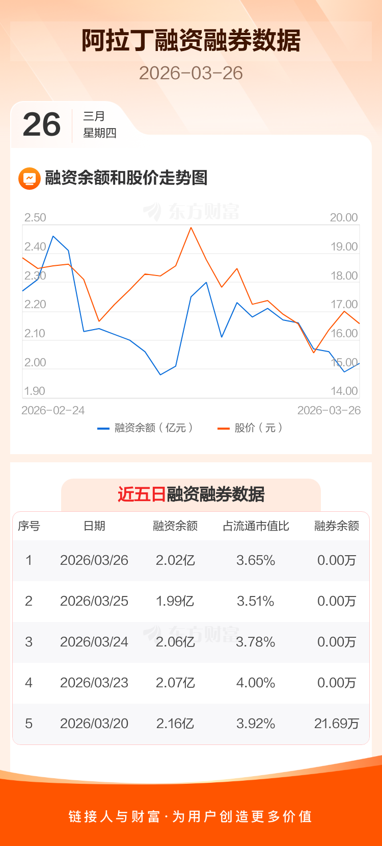 交易所最新数据显示,阿拉丁于2026年3月26日获融资买入1316.81万元,融资偿还1001.68万元,当日融资净买入315.13万元。目前,该股融资余额2.02亿,占流通市值比例为3.65%。